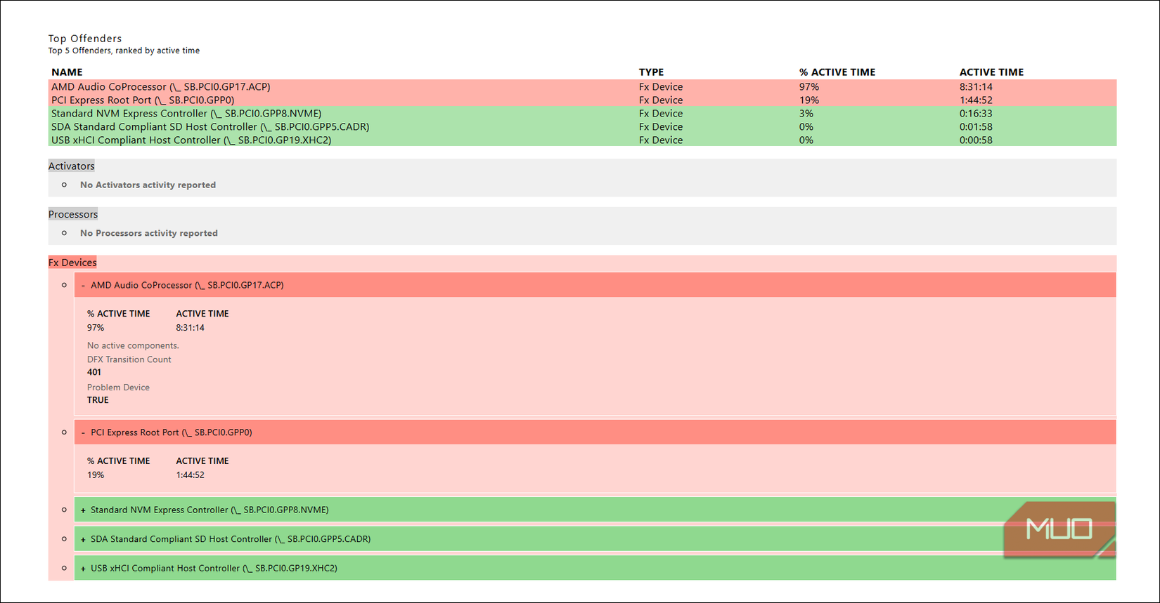 আমার রিপোর্ট সরাসরি এই নির্দেশ এএমডি অডিও কোপ্রসেসর. এটি 97% ঘুমের সেশনের জন্য সক্রিয় ছিল, ল্যাপটপের ঘুমানোর সময় 8 ঘন্টারও বেশি একটানা কার্যকলাপ। প্রতিবেদনে এটিকে একটি “সমস্যা ডিভাইস” হিসাবে চিহ্নিত করা হয়েছে এবং এটি দৃশ্যত DRIPS নামক একটি গভীর নিম্ন-শক্তির অবস্থায় প্রবেশ করতে সিস্টেমটিকে বাধা দিচ্ছে। এটি ব্যাটারি ড্রেন এবং তাপ উভয়ই ব্যাখ্যা করেছে।