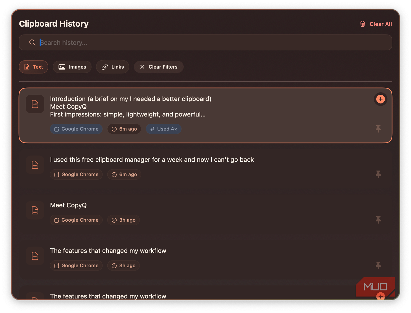 - সত্যিই কি কাজ করে তা খুঁজুন এবং ফিল্টার করুন: CopyQ এর সার্চ বার খুব দ্রুত এবং নির্ভুল। আমি টেক্সট থেকে একটি কীওয়ার্ড টাইপ করতে পারি বা আমি কয়েক ঘন্টা আগে কপি করেছি একটি লিঙ্ক, এবং CopyQ তাৎক্ষণিকভাবে আমার জন্য এটি খুঁজে পায়। আমি থিম, ফন্ট, রং এবং সামগ্রিক চেহারা আমার পছন্দ অনুযায়ী কাস্টমাইজ করতে পারি।