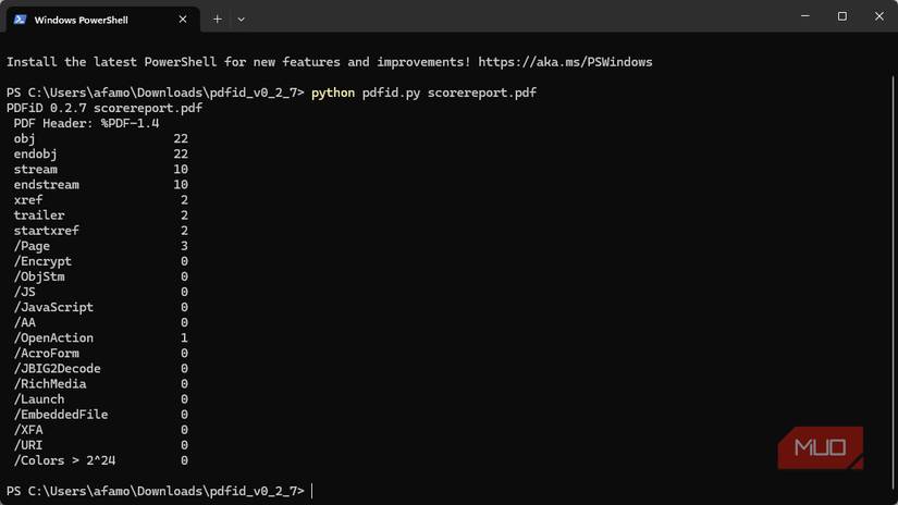 python pdfid.py C:\Users\You\Downloads\suspicious.pdf