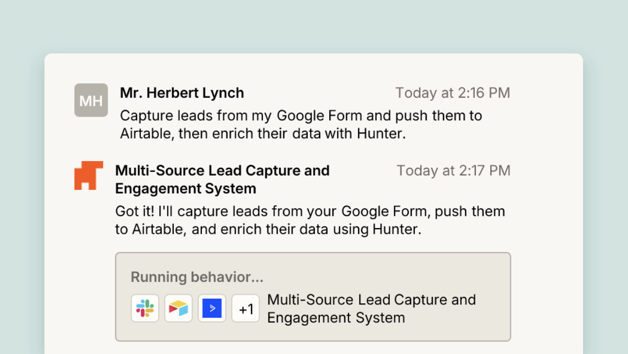 প্রো টিপ: আপনি বিভিন্ন উত্স থেকে লিড সংগ্রহ করছেন? নীচের কাস্টমাইজযোগ্য টেমপ্লেটের সাহায্যে, আপনি একটি Zapier এজেন্ট তৈরি করতে পারেন যা স্বয়ংক্রিয়ভাবে ক্যাপচার করে, সমৃদ্ধ করে এবং একাধিক টুল থেকে লিড লালন করে। Zapier এজেন্ট সম্পর্কে আরও জানুন।