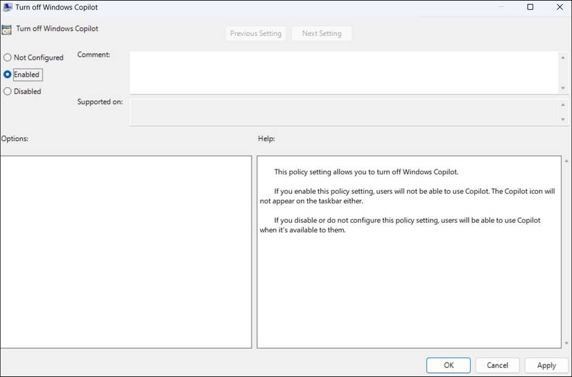 এই পদক্ষেপগুলি প্রসঙ্গ মেনুতে বিরক্তিকর জিজ্ঞাসা কপিলট বিকল্প সহ কপিলট থেকে মুক্তি পাবে। আপনি যদি সিদ্ধান্ত নেন যে CoPilot উপযোগী, আপনি সেটিকে সেট করে পুনরায় সক্ষম করতে পারেন উইন্ডোজ কপাইলট বন্ধ করুন নীতিতে কনফিগার করা হয়নি অথবা সেট করে টার্ন অফ উইন্ডোস্কোপাইলট প্রবেশ করা 0.